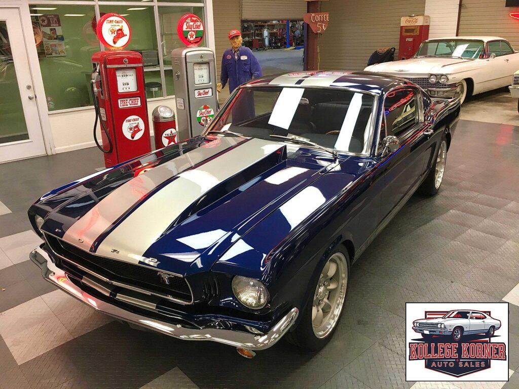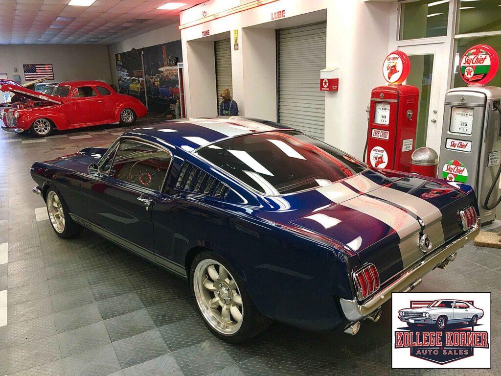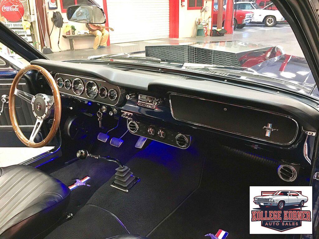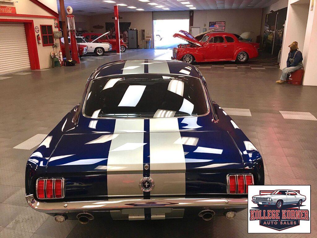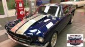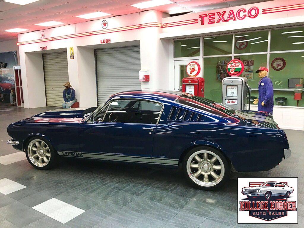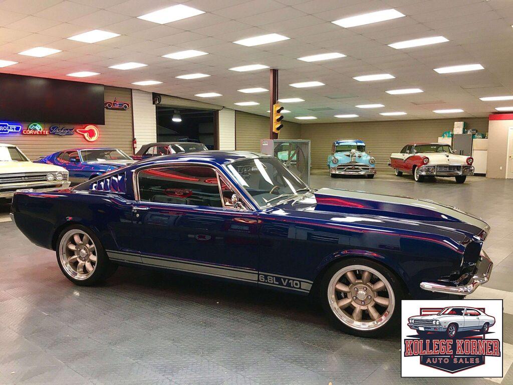 1965 Mustang Restomod with a 6.8L Triton V10, Tremec 5-speed manual transmission, and custom suspension. Features air ride, Wilwood disc brakes, Scat Rally seats, and a unique Lexus Indigo Blue and Pepper Gray paint job. Built with meticulous craftsmanship and designed for a thrilling driving experience.