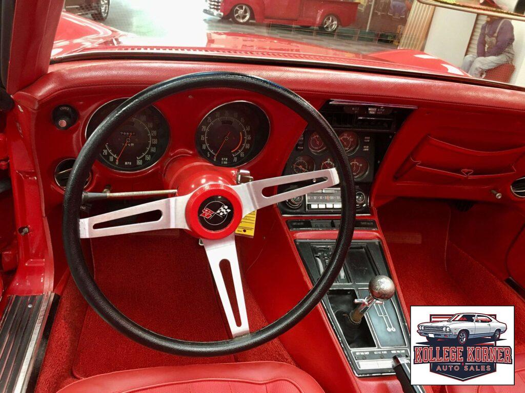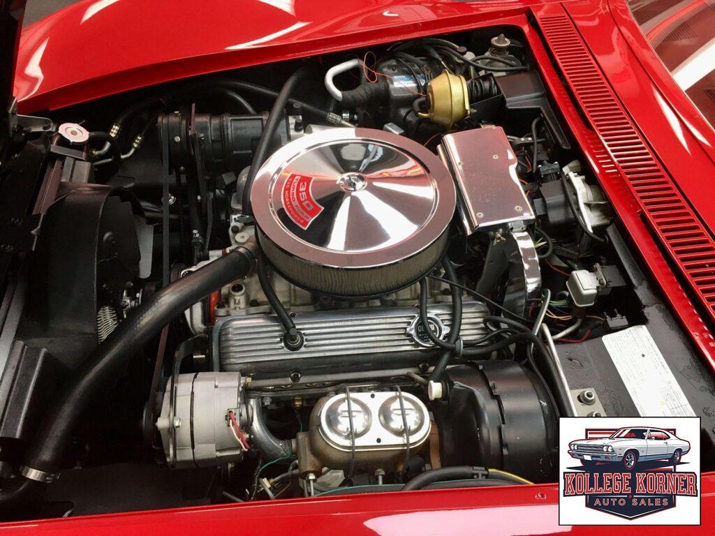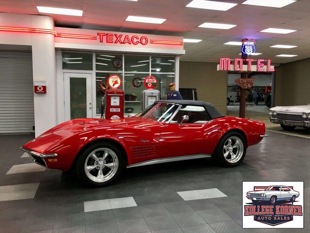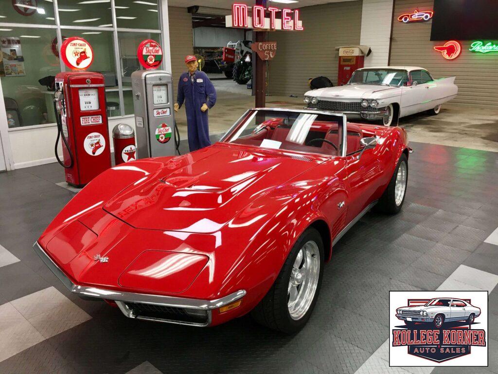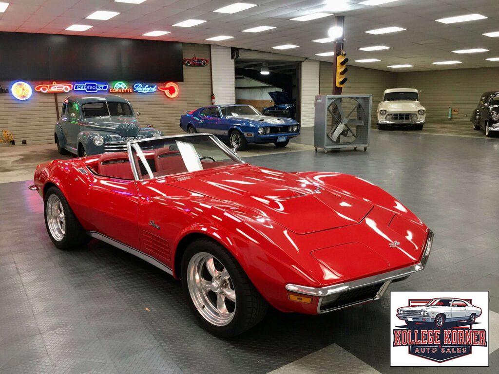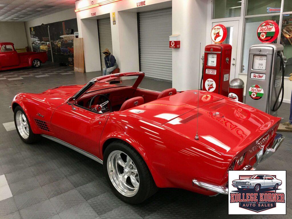 1971 Chevrolet Corvette Convertible with a 350 V8, MSD fuel injection, and 4-speed manual transmission. Features upgraded suspension, air conditioning, power windows, and 18″ American Alloy wheels. Beautiful red paint, original red interior, and an arrow straight body. Runs and drives excellent with enhanced power and performance.