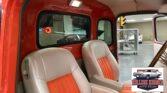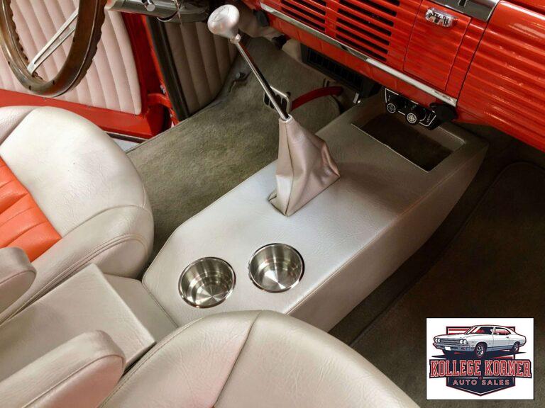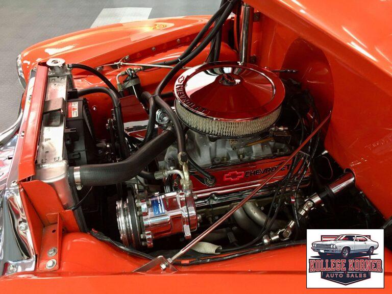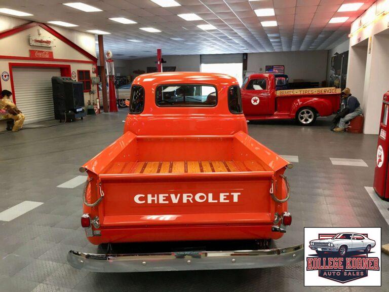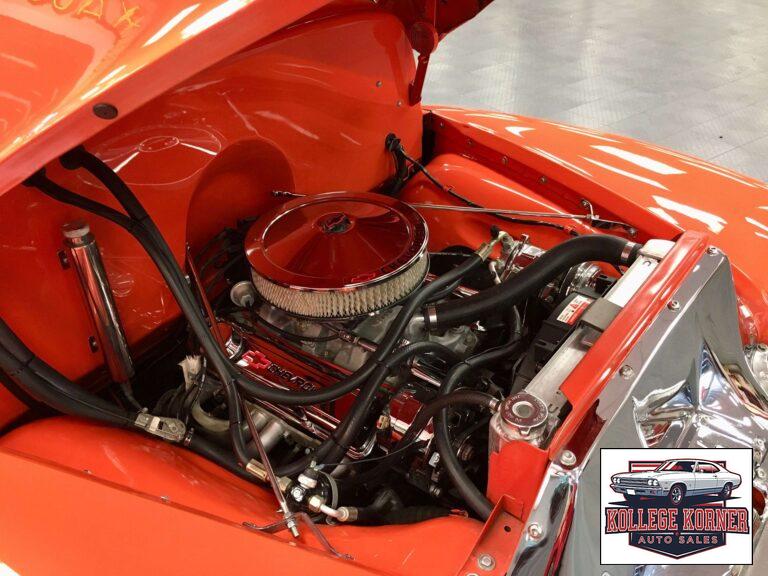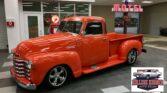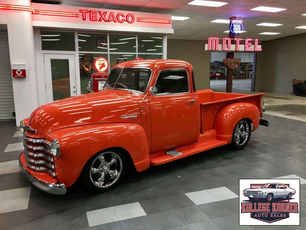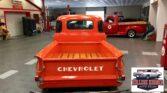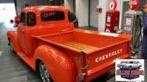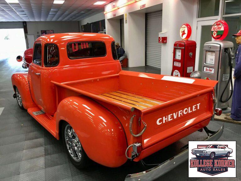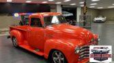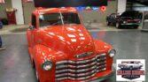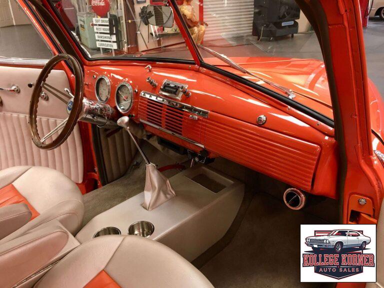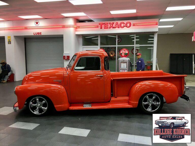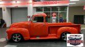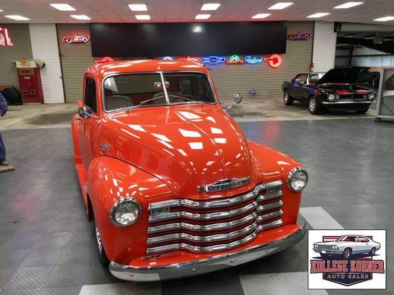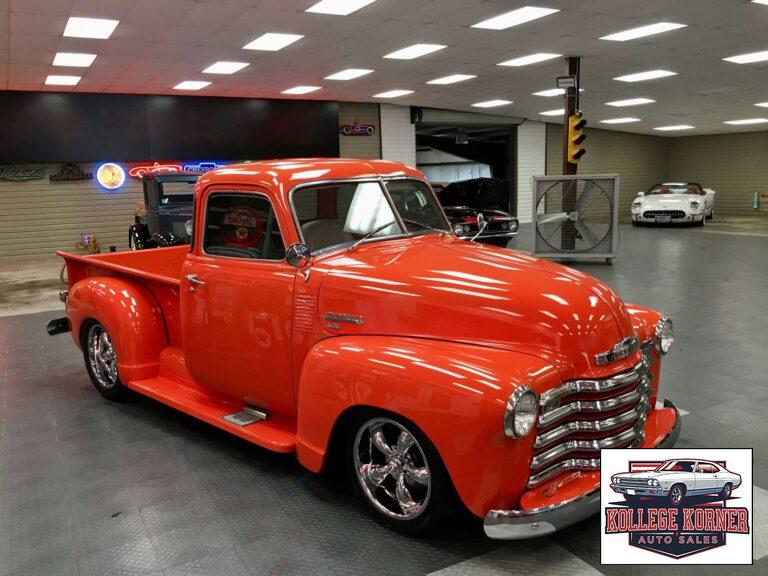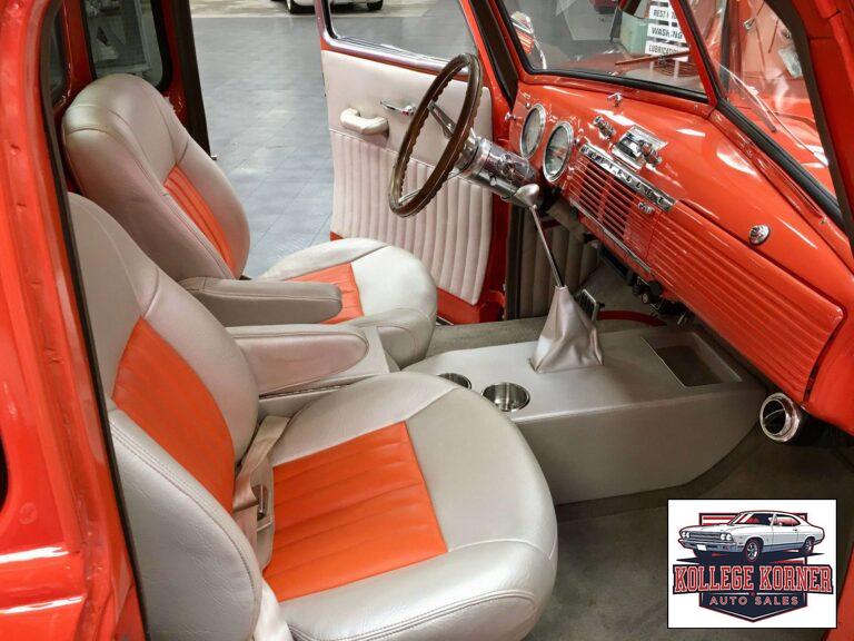 The 1950 Chevrolet 3100 blends vintage design with modern power. Equipped with a 350 V8 and Turbo 350 transmission, it offers a smooth drive. Finished in Hugger Orange with new chrome and stainless, it also has power steering, disc brakes, and A/C.